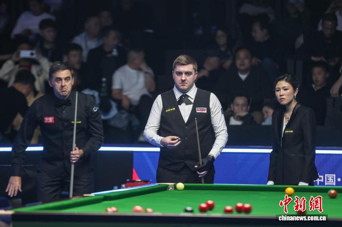 图为罗斯·缪我(图中)、罗僧·奥沙利文(图左)正在角逐中考察桌上情势。中新社记者 刘力鑫 摄