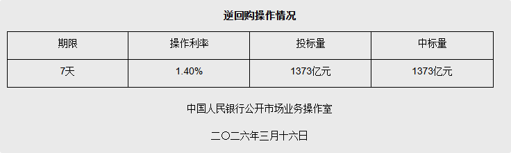 3月16日央行开展1373亿元7天期逆回购操作