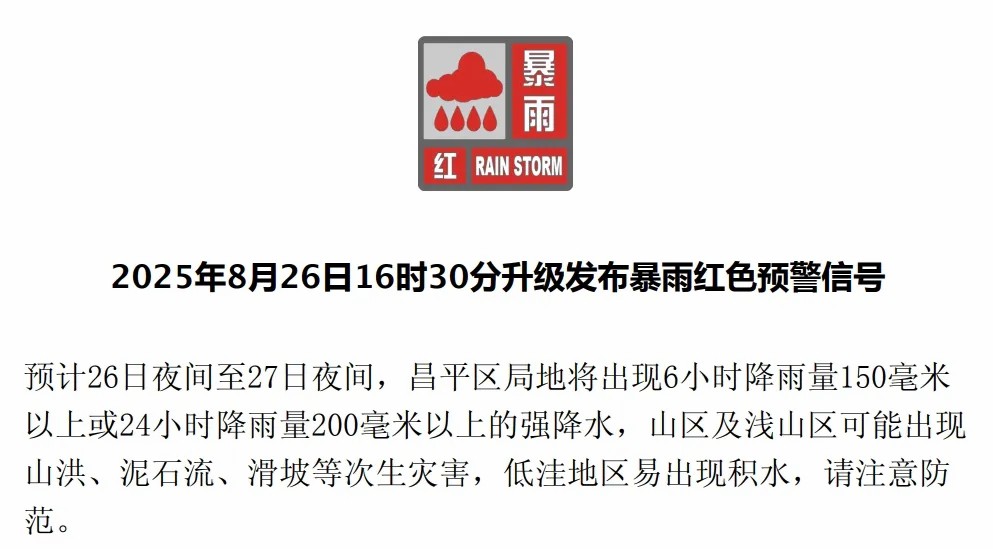 8月26日电 据“气呼呼象北京”Wechat大众号新闻,北京市怀柔区、昌仄区气呼呼象台揭晓暴雨预警旌旗灯号。 估量26往后三更至27昼夜间,怀柔区将呈现6小时落雨量150毫米以上或者24小时落雨量200毫米以上的强落火,山区及浅山区大概呈现山洪、泥石淌、滑坡等次死灾难,崎岖区域易呈现积火,请注重提防。