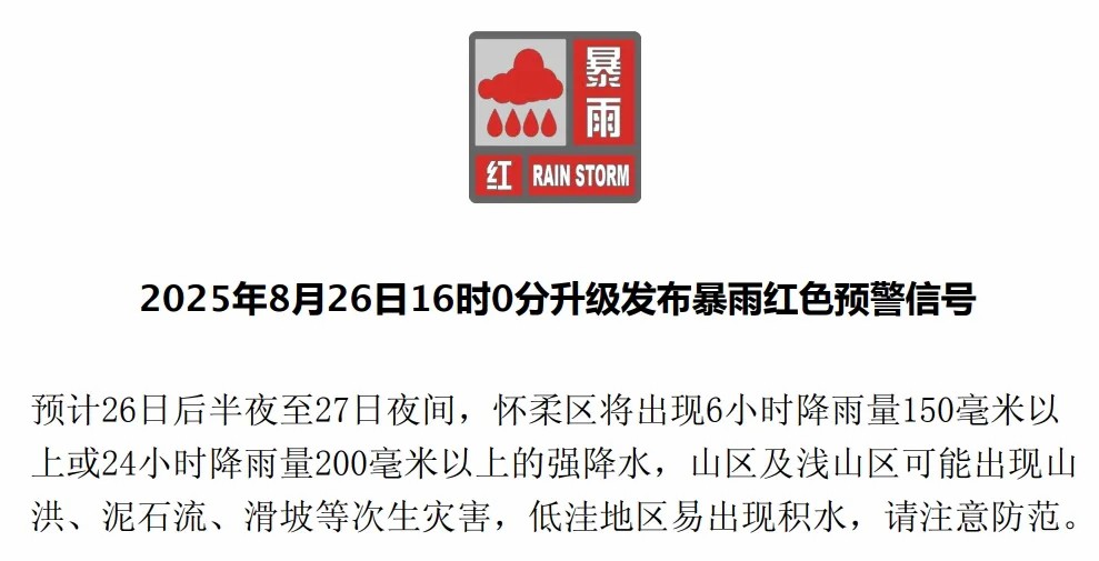 8月26日电 据“气呼呼象北京”Wechat大众号新闻,北京市怀柔区、昌仄区气呼呼象台揭晓暴雨预警旌旗灯号。 估量26往后三更至27昼夜间,怀柔区将呈现6小时落雨量150毫米以上或者24小时落雨量200毫米以上的强落火,山区及浅山区大概呈现山洪、泥石淌、滑坡等次死灾难,崎岖区域易呈现积火,请注重提防。